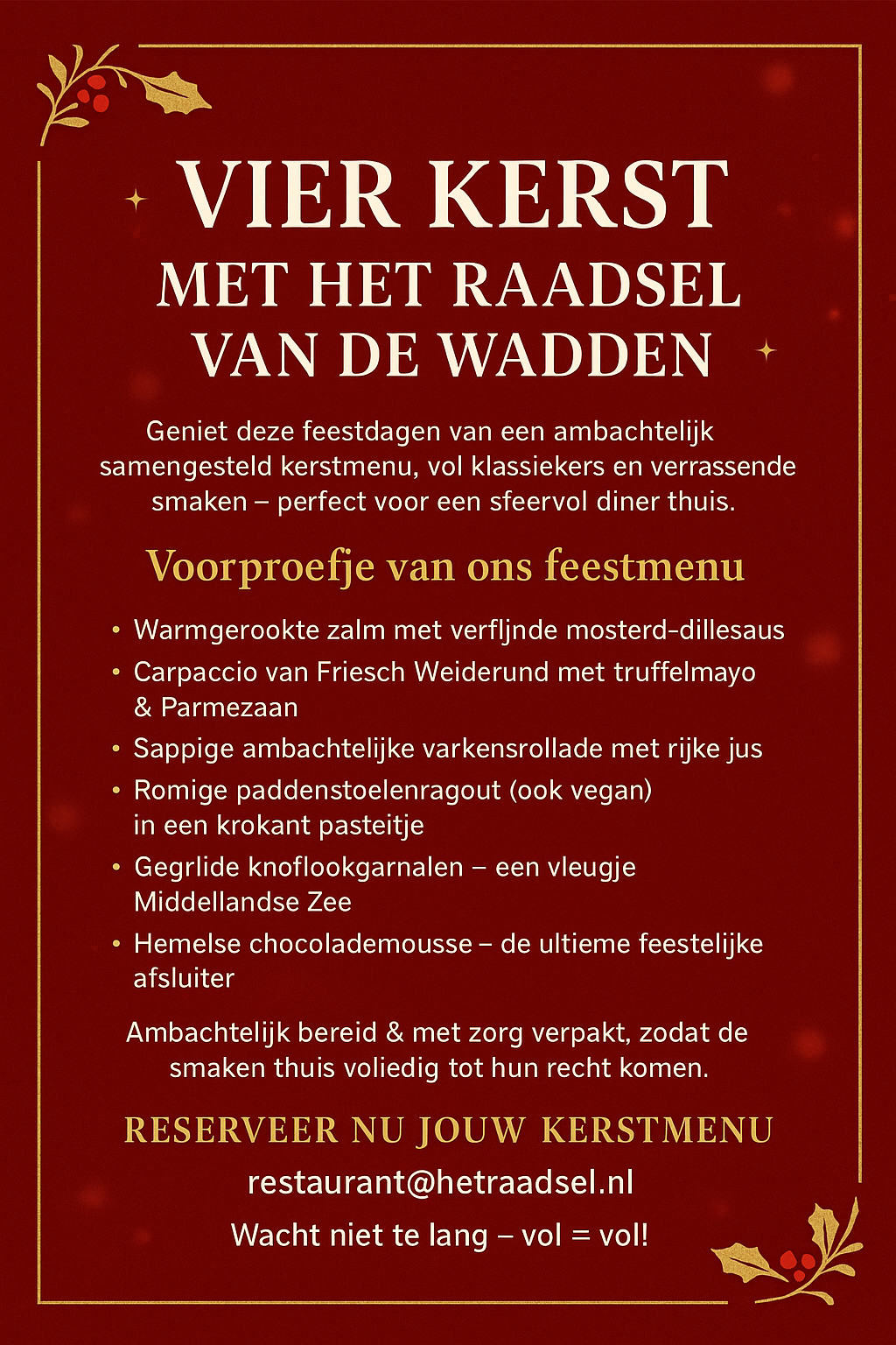 Reserveer eenvoudig jouw kerstmenu via: restaurant@hetraadsel.nl