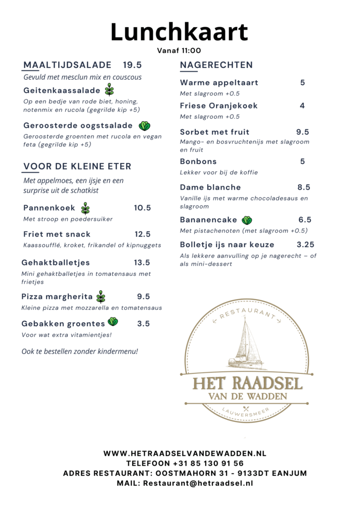 Bij Het Raadsel van de Wadden hebben we een gevarieerd, dagelijks wisselend menu, zodat er voor ieder wat wils is. We laten je graag kennismaken met het moois wat onze omgeving te bieden heeft: variërend van Lokaal Fries Weiderund tot aan verse vis uit Lauwersoog.